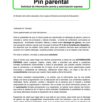 El (mal) llamado “pin parental” es la medida acordada desde el jueves 16 de enero entre PP, Ciudadanos y Vox en la comunidad de Murcia. Consiste en una solicitud de veto que los progenitores podrán imponer en los colegios e institutos a cursos, asignaturas, actividades y demás propuestas formativas obligatorias sobre igualdad o educación sexual. El partido de extrema derecha ha utilizado la implantación de esta disposición a cambio de la aprobación de los presupuestos para el año 2020 en la comunidad.