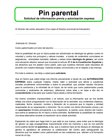Si a alguien le parece que ya ha escuchado el nombre con el que han bautizado a este veto, es porque proviene de la contraseña numérica que los padres configuran en los televisores, para evitar que los menores de edad accedan a contenidos que no consideran adecuados para la edad de sus hijos. Ahora, ese bloqueo se quiere implantar a la educación, contra el “adoctrinamiento” que aseguran que tiene lugar en forma de materias que educan en “ideología de género”, que es como se refieren a la lucha por la igualdad y los derechos LGTBI.