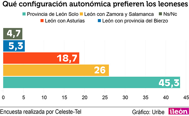 Preguntados sobre si apoyarían una nueva comunidad de León al margen de Castilla, más de la mitad de los encuestados respondieron a favor. Respecto a la configuración de la comunidad autónoma la mayoría de los leoneses encuestados respondieron a favor de una comunidad uniprovincial. Un 26% está a favor de una comunidad formada por León, Zamora y Salamanca.