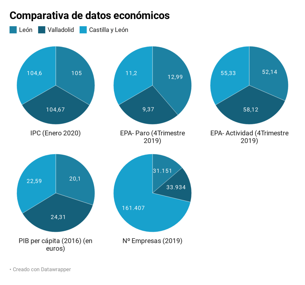 En cuanto a los datos económicos el IPC de enero de 2020 sitúa a León 323 puntos por encima de Valladolid. Sobre el IPC de Castilla y León, la provincia lo supera por 397 puntos.