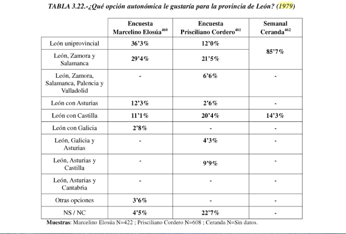 Cuatro sondeos en 1979, llevados a cabo por dos sociólogos, Marcelino Elosúa y Prisciliano Cordero; una revista llamada Semanal Cerranda y la diputación de León preguntaron a la sociedad leonesa sobre el estatuto de autonomía.