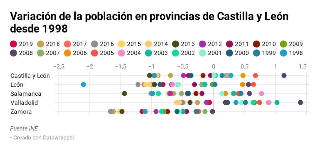 Sin duda otro de los grandes problemas de León es su demografía. El año pasado León contaba con 460.000 habitantes. En una provincia de 15.581 km cuadrados y 33.8 habitantes por km cuadrado se han perdido el 11% de los habitantes desde 1998, año que, además, ostenta el mayor porcentaje de pérdida de población en la provincia.